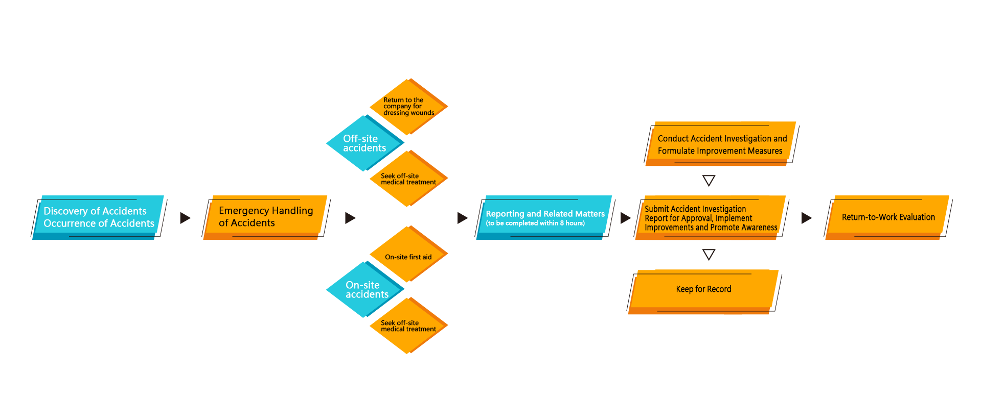 The Occupational Safety and Health Annual Plan includes at least 16 management objectives for tracking and management. It is jointly promoted by various departments, with related departments involved in planning and implementation. In addition, an internal/external accident and disaster notification procedure is established. Accident investigations cover the type of accident, direct and indirect causes, severity of the accident, follow-up improvement measures, and ongoing care and monitoring. This information serves as preventive measures and for resumption of work assessments.