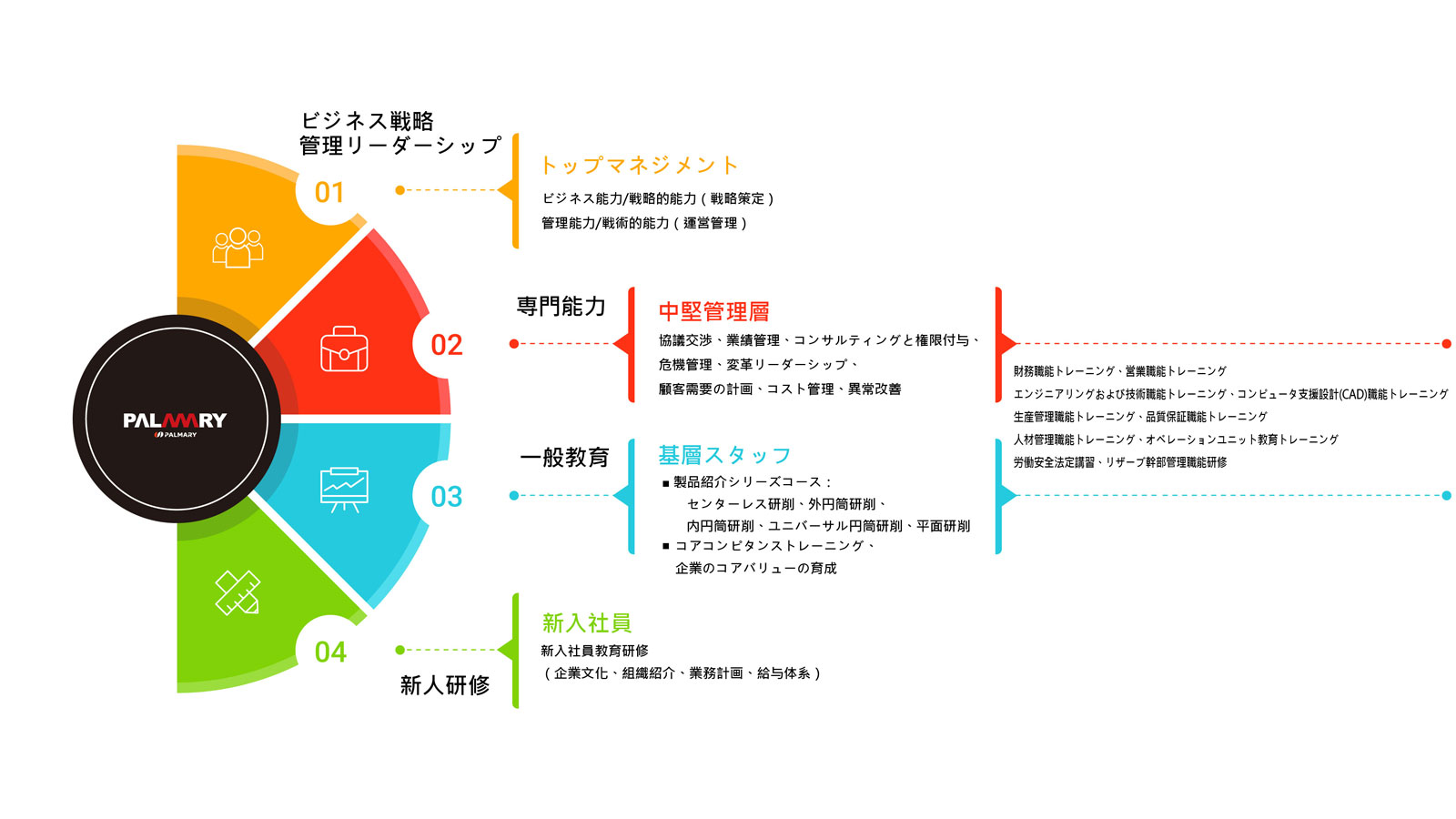 01新入社員に企業文化、核心的な価値観、企業倫理の概念を浸透させ、基本的な業務スキルを教える。